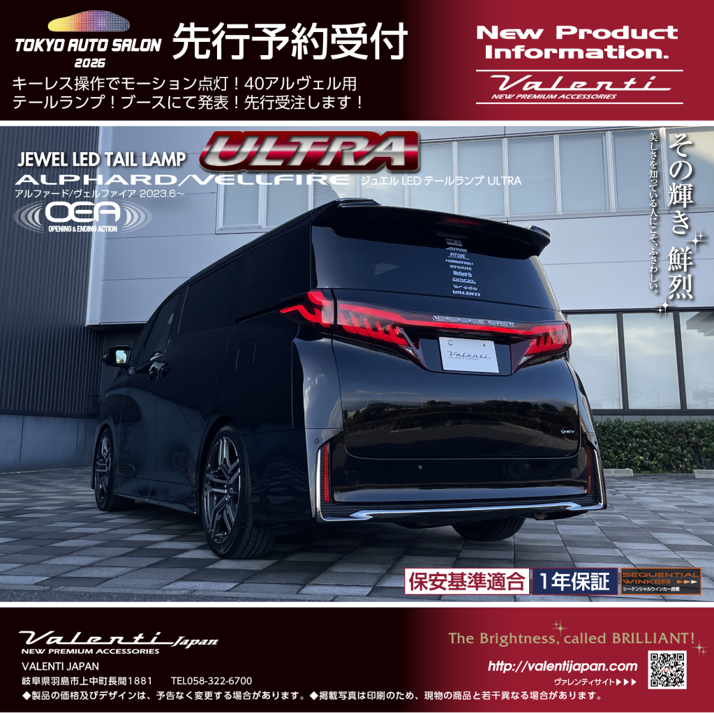 東京オートサロン2025開催時にコンセプトモデルとして発表した、40アルファード・ヴェルファイア用のテールランプ。コンセプトモデルから開発期間1年を要し、東京オートサロン2026ヴァレンティブースにて製品版をお披露目します。会期中、こちらのジュエルLEDテールランプULTRAの40アルファード、ヴェルファイア用を先行受注させて頂きます。
