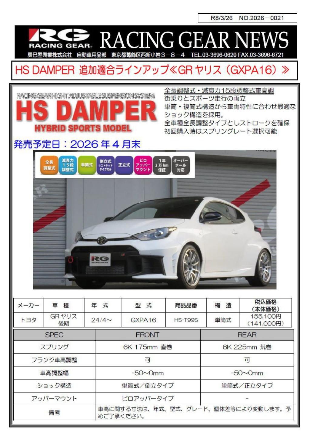 【新商品】HSダンパー 追加ラインアップ(トヨタ GRヤリス GXPA16)