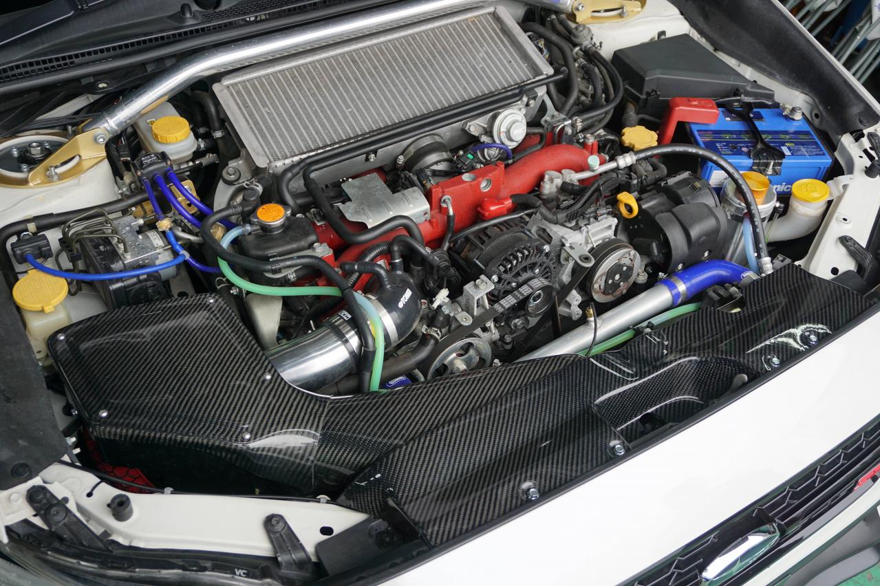 「WRX系で真っ先に手掛けるのは冷却系です。エンジンルーム内の空気の抜けが悪く、水温が上がりやすい。対策として冷却効率の高いラジエターに交換し、インテークガイドで多くの空気を入れて、エアロボンネットで上手に抜く必要があります。こうすればサーキットの連続周回でも水温を理想と言える85~95℃にキープできますよ」と近藤さん。