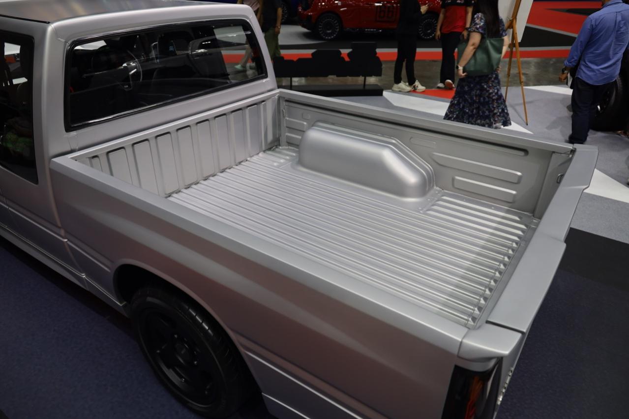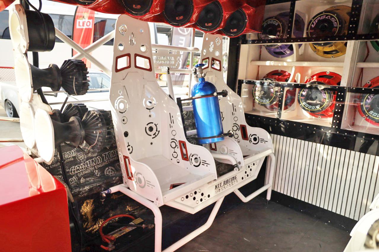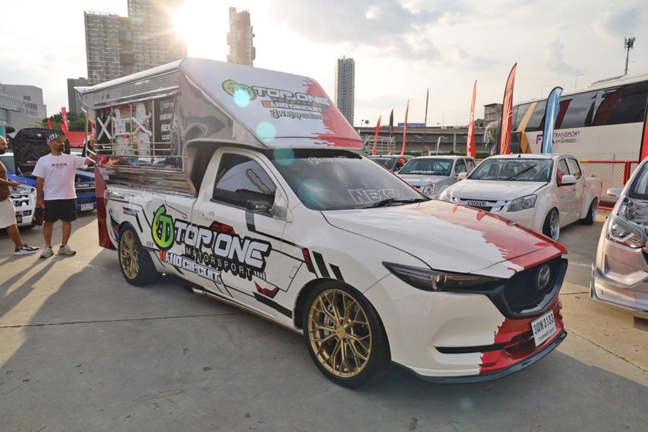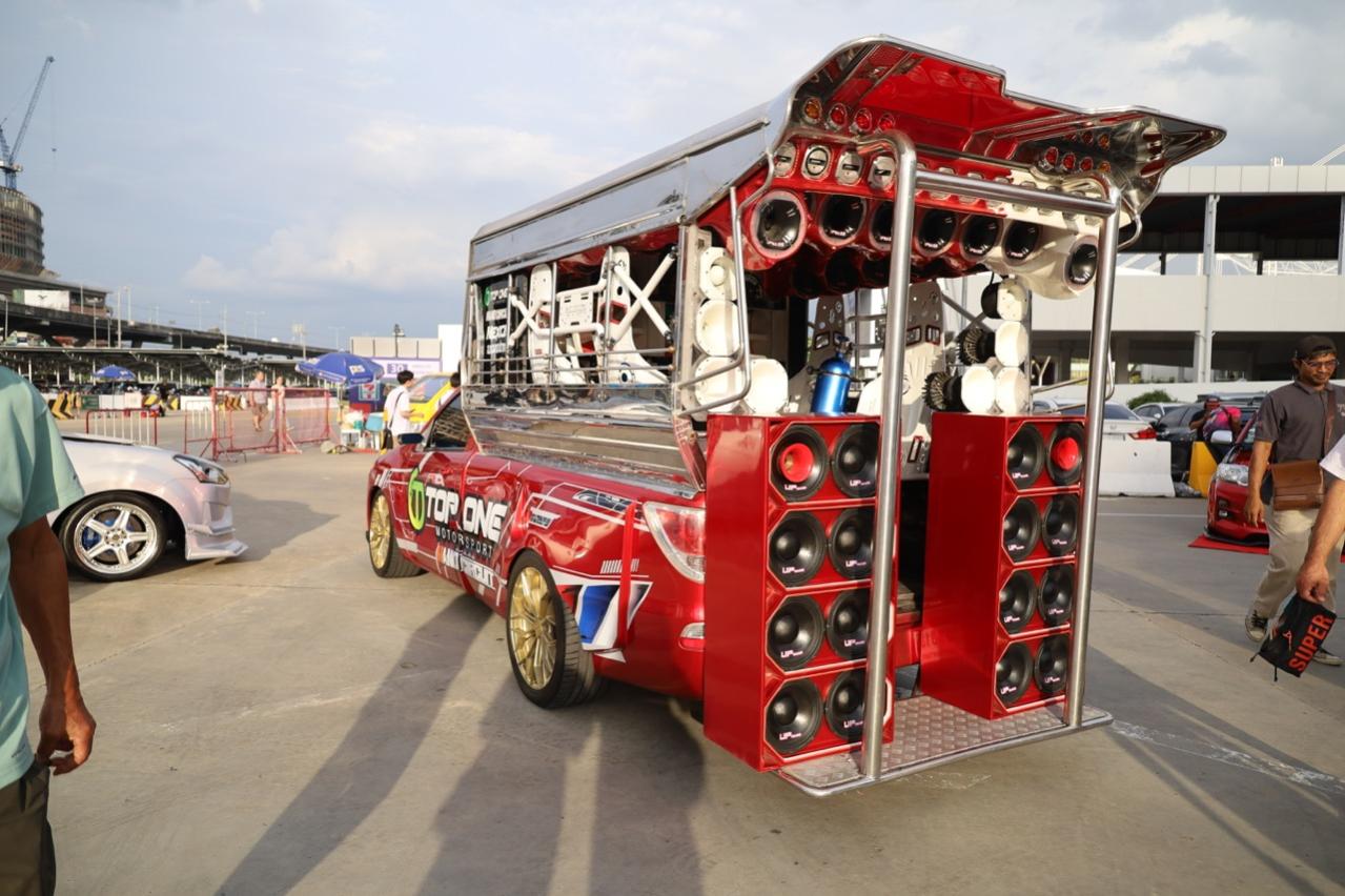 屋外エリアで行われているカークラブミーティングで発見した1台。一見するとタイの都市部や観光地で周遊運行している『ソンテウ』のような見た目だが、マツダのピックアップトラックBT-50(だと思われる)をベースにフェイススワップやワイドボディ化が施されている模様。座席はフルバケ仕様で多数のスピーカーも搭載されているなど、遊び心満点の仕上がりだった。
