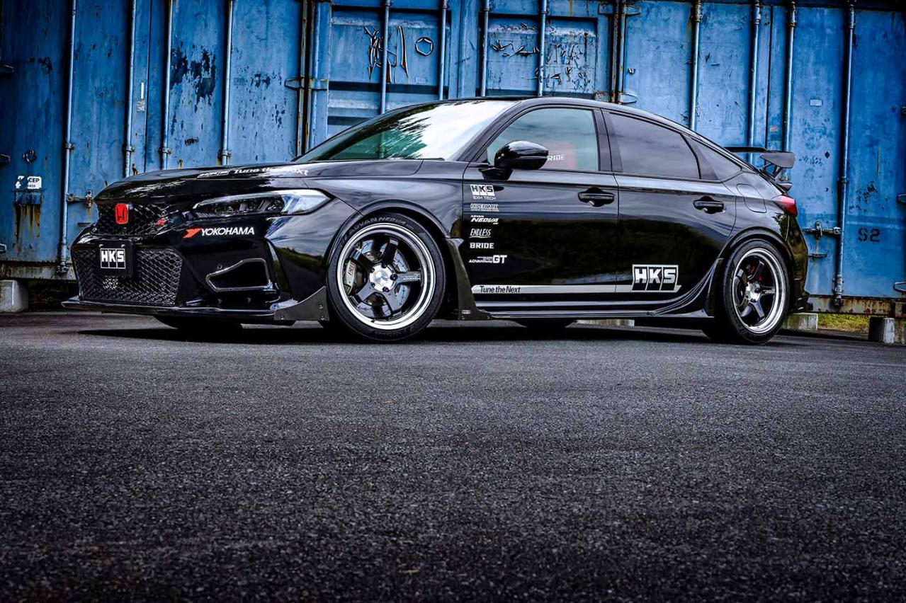漆黒のFL5にベストマッチする新作ホイールが、アドバンレーシングの定番モデル「GTビヨンド」のバリエーション“R”。HKSのデモカーに装着された18インチ「ダイヤモンドカット&ダークプラチナブラック」は、深いリムと鋭い5スポークが生み出す陰影によって、FFとは思えない迫力を演出する。