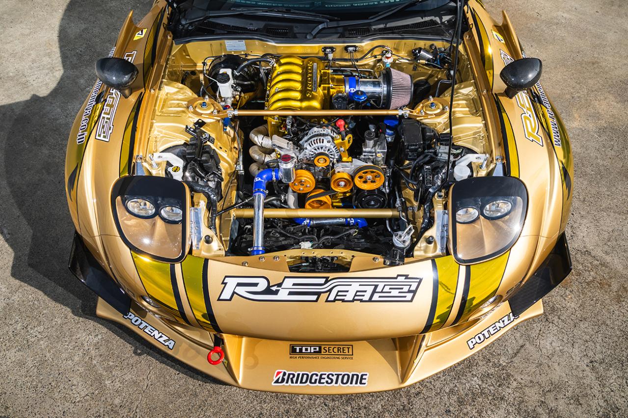 エンジンは9000rpmまで鋭く淀みなく吹け上がる3ローターNAで、トランスミッションはRX-8純正6速MTに換装。LINK G4Xによる制御でスロットルも電子制御化されているなど、RE雨宮が考える“ストリート最強スペック”として仕上げられているとのこと。