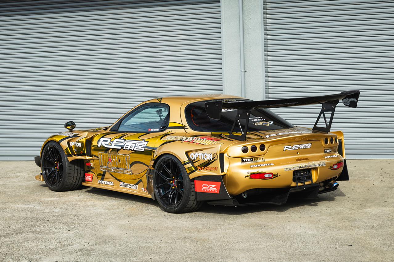 外装はRE雨宮のD1ワイドボディキットCFモデルをベースにほぼワンオフで製作された2メートルオーバーのワイドボディ仕様。