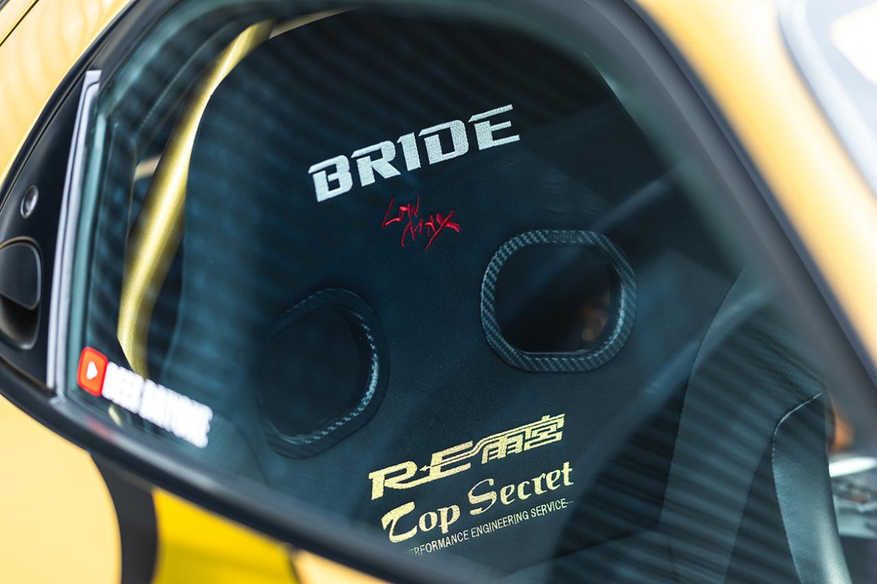 もちろん内装もブラック基調で統一したうえでAIM製デジタルメーターを取り入れるなどスキのない仕上がり。シートはRE雨宮とトップシークレットのロゴが入ったBRIDE製コラボモデルが装着されています。
