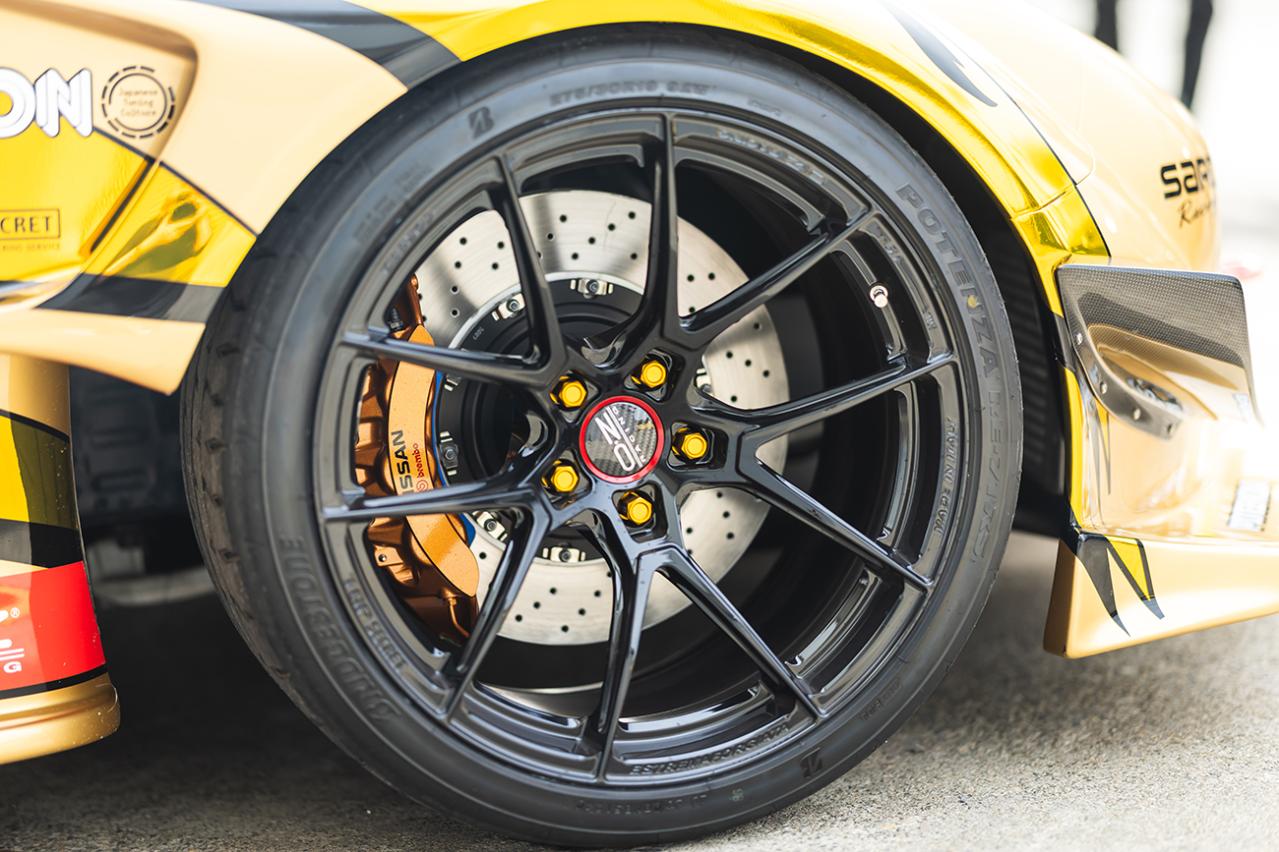 足まわりもRE雨宮製スーパーレーシングを軸に構築され、トップシークレットが展開する19インチホイールのOZ34GT-Rエストレマフォージド(F/R:10.5J+15)という組み合わせ。フロントにR35GT-R純正ブレンボキャリパーを装着するなど、トップシークレット色もしっかりと取り入れられています。