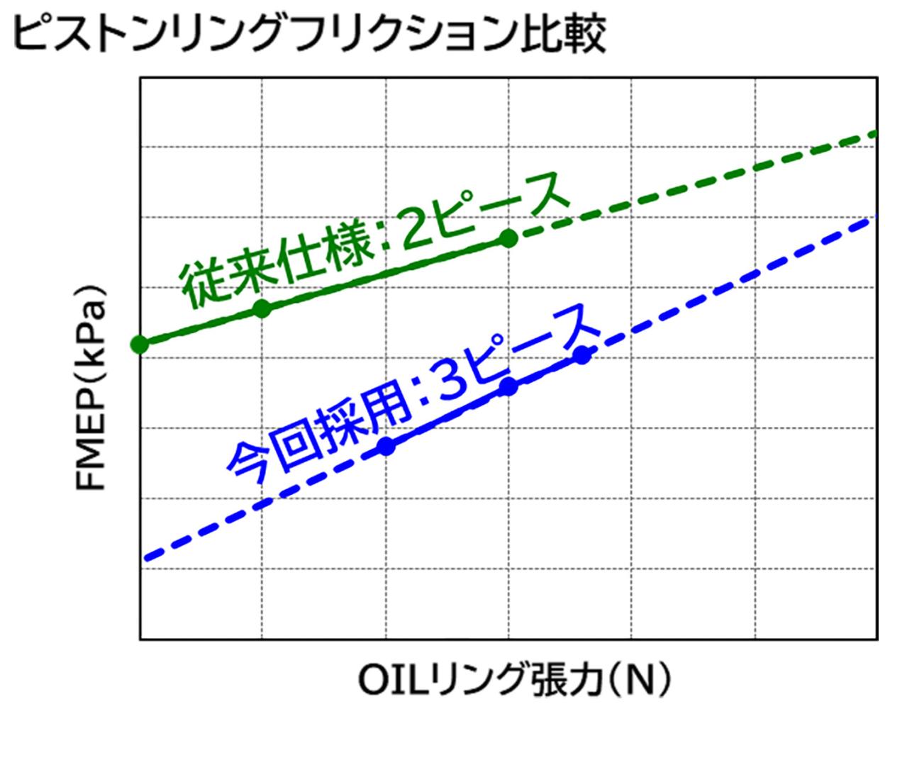 TYPE-LFは低フリクションと高いシール性能の両立を狙い、最新の理論に基づいて設計されたピストンリング。TOPリングではブローバイ低減と熱伝導性の向上を図り、2NDリングはリング挙動の安定化によってシール性を高める。さらにOILリングには3ピース構造を採用し、フリクション低減とオイルコントロール性能のバランスを最適化している。